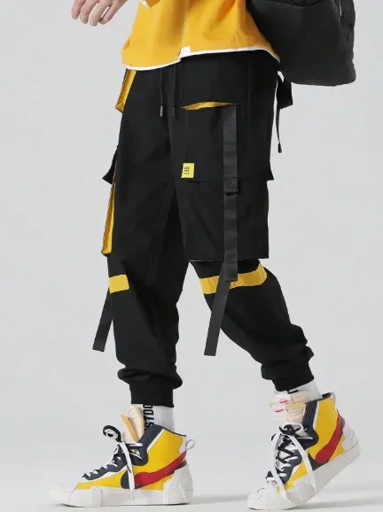 Este moderno y versátil cargo negro con detalles amarillos y tiras es la elección perfecta para un estilo urbano y casual. Confeccionado con materiales de alta calidad, este cargo te brindará comodidad y estilo a donde quiera que vayas.